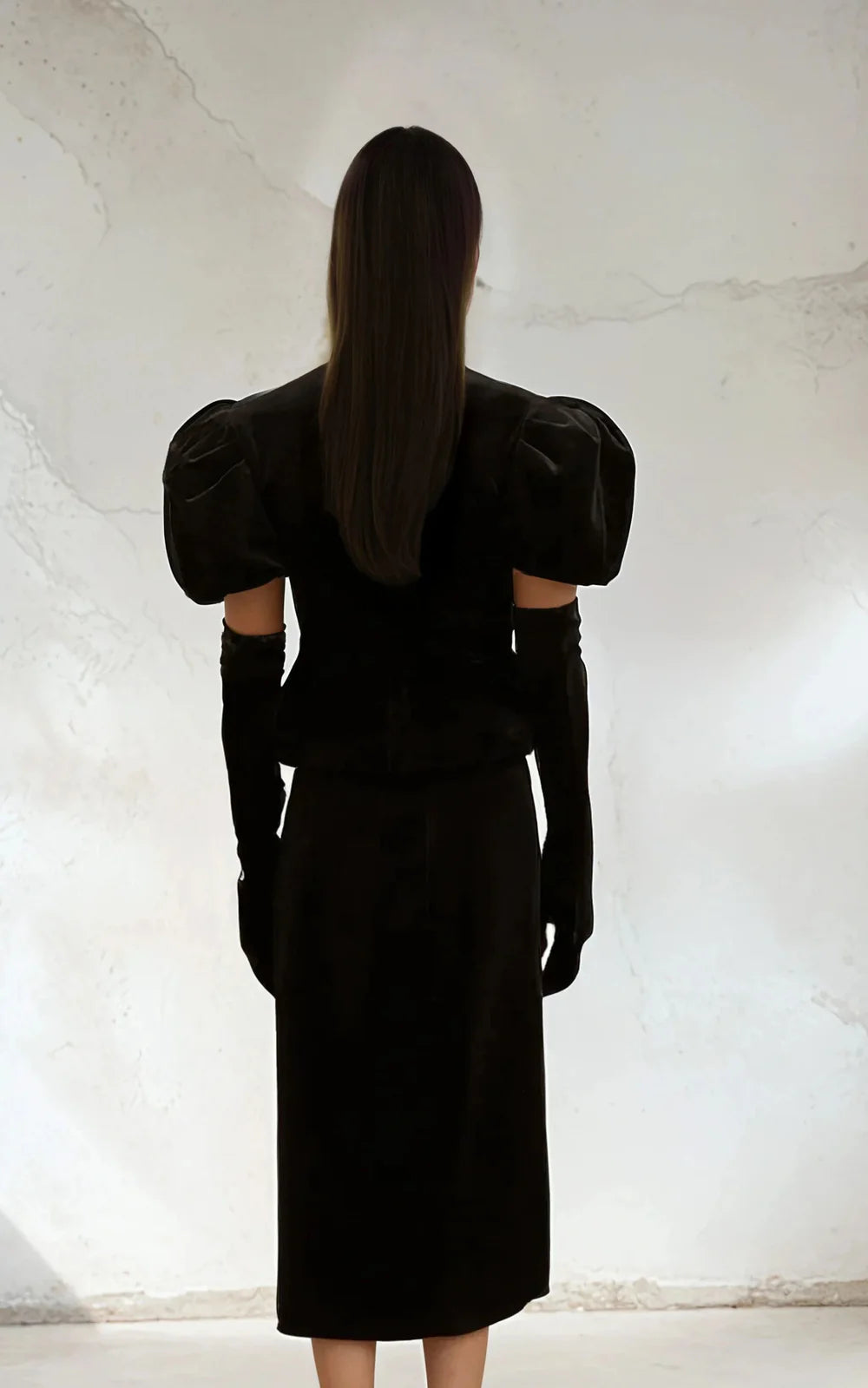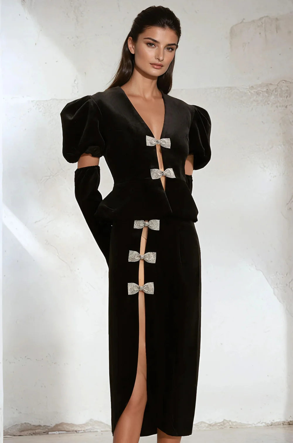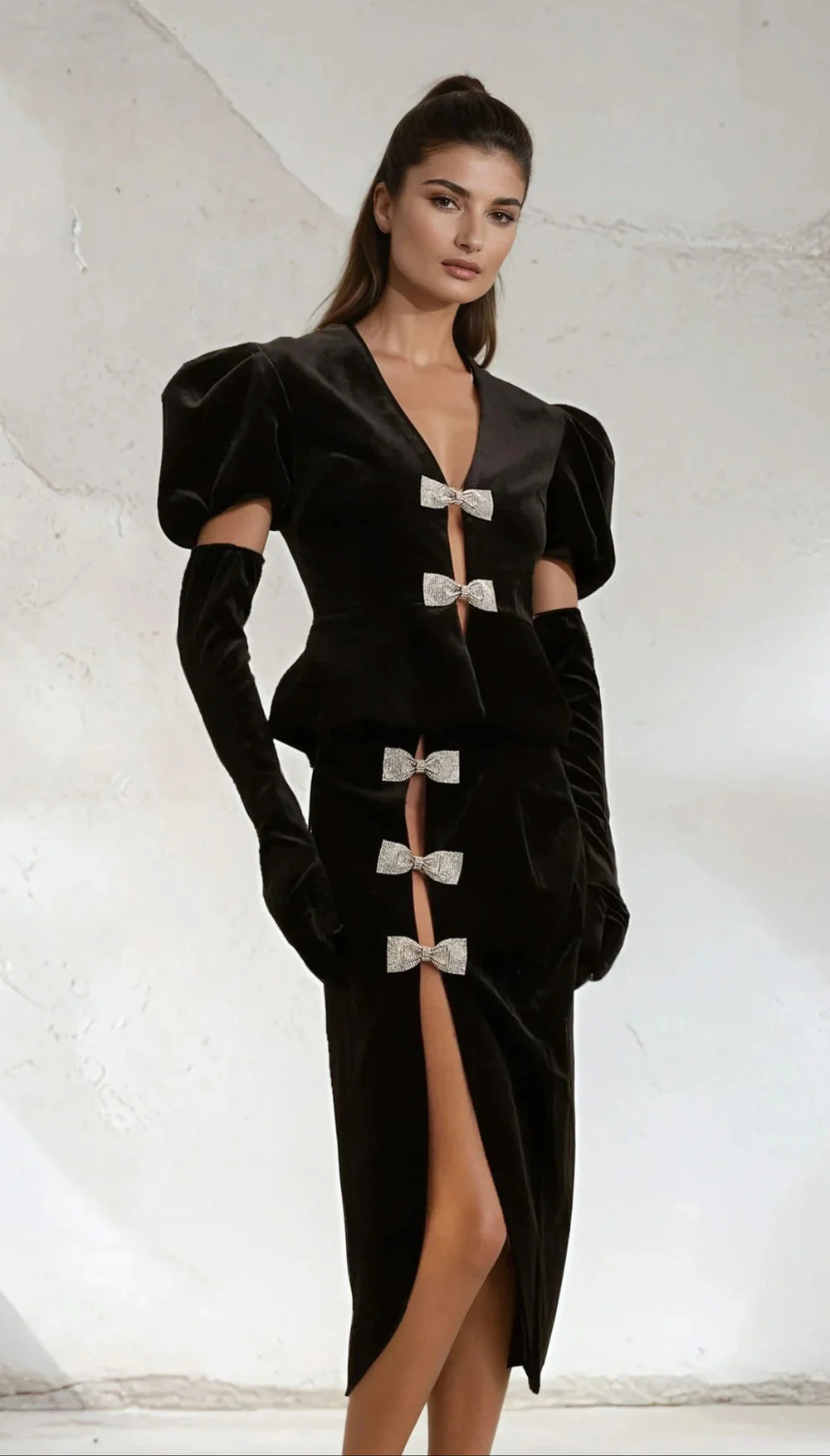 This striking two-piece black velvet ensemble channels vintage glamour with a playful, modern twist. It features a plunging V-neck peplum jacket with dramatic puff sleeves and cut-out shoulders. The jacket and the coordinating midi skirt are fastened with dazzling, oversized crystal-embellished bow clasps that run down the center, creating peek-a-boo cutouts and a seductive high slit on the skirt. Paired with coordinating long velvet opera gloves, this luxurious and bold look is the perfect showstopper for a high-fashion party, New Year's Eve celebration, or a unique formal event.