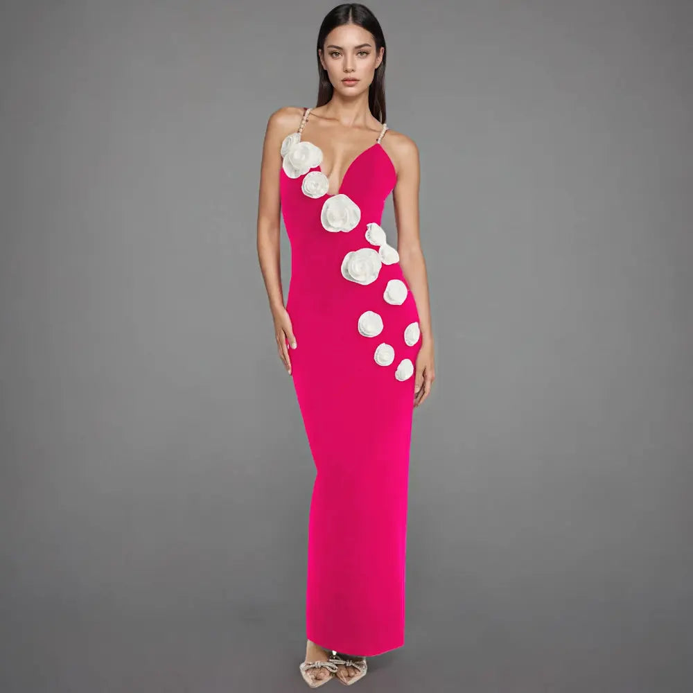 This bold and beautiful maxi dress is designed to make a statement. It comes in a striking fuchsia pink and has a form-fitting silhouette. The dress is adorned with a trail of white floral appliqués that elegantly cascade from the bust down one side. The delicate, pearl-beaded straps add a touch of sophistication and serve as the perfect finishing detail. It's an ideal choice for a special occasion or a glamorous evening event where you want to stand out.