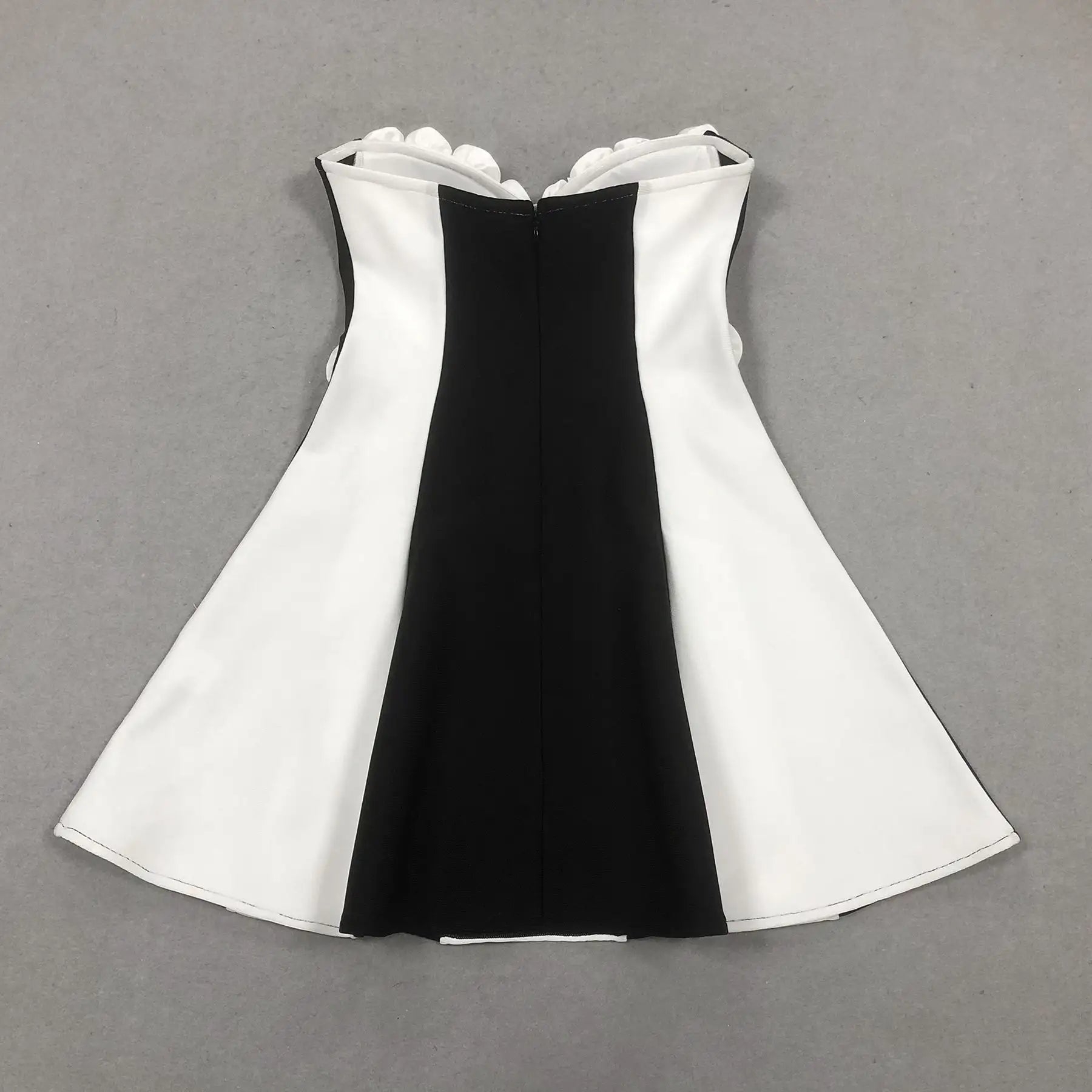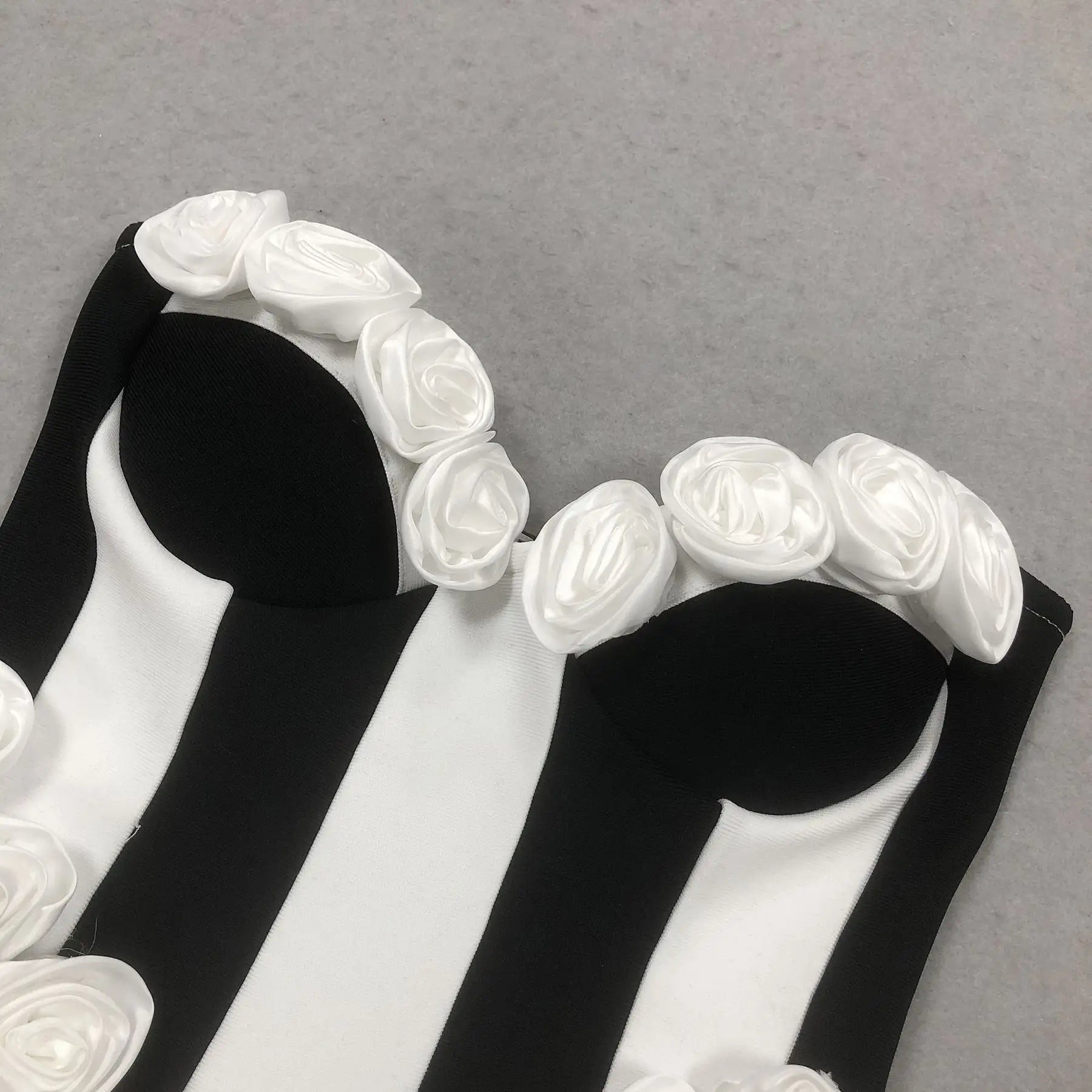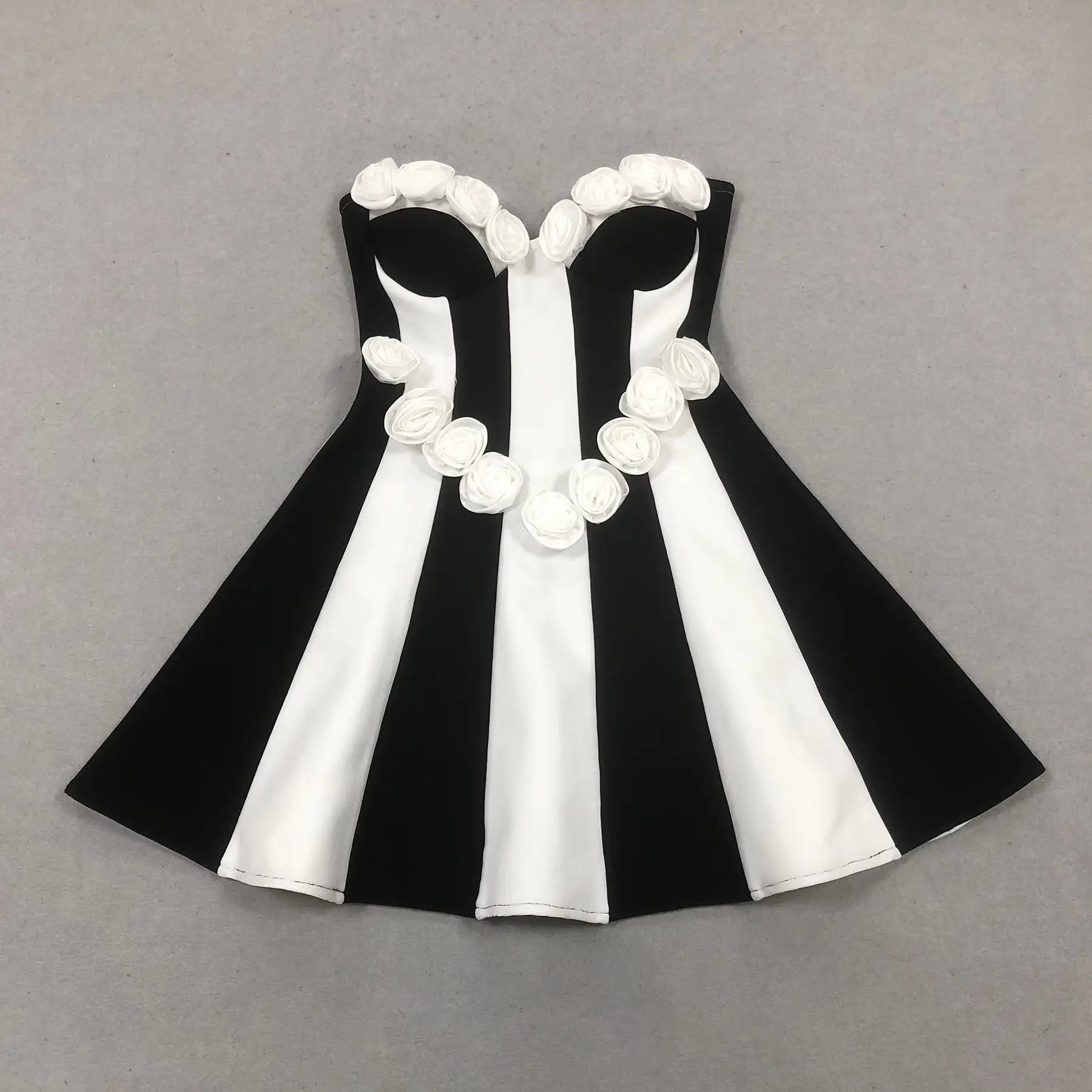 This playful yet structured strapless mini dress makes a dramatic statement with its bold, high-contrast black and white vertical stripes. The design features a flattering, corset-style bodice that shapes the figure before flaring out into a voluminous A-line skirt. Delicate white 3D rosette embellishments trace the sweetheart neckline and follow the curve of the waist, adding a whimsical, feminine touch to the striking graphic pattern. This sophisticated and flirty dress is an ideal choice for cocktail parties, themed events, or memorable nights out where you want to stand out.