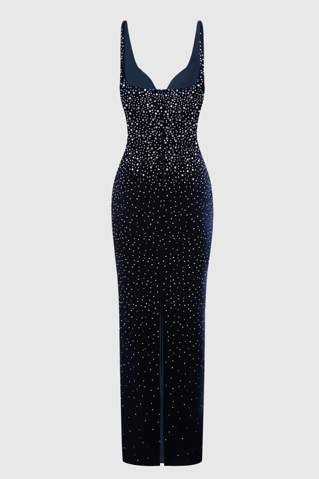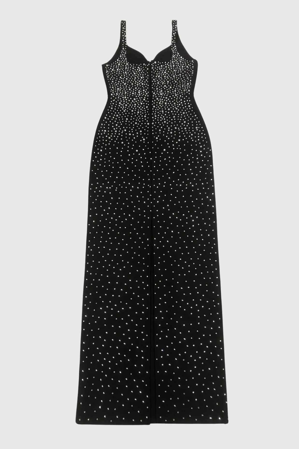Make a glamorous and sleek statement in this body-contouring black bandage maxi dress, engineered to create an hourglass silhouette. The sophisticated design features a high neck that transitions into a dazzling crystal-embellished choker collar, adding a touch of opulent hardware. The entire gown is threaded with subtle, shimmering metallic or sparkly vertical striping, which enhances the body-shaping effect of the bandage knit. This exquisite, floor-length piece is the perfect blend of structure and sparkle for a high-end cocktail party, gala, or any event where commanding presence is key.