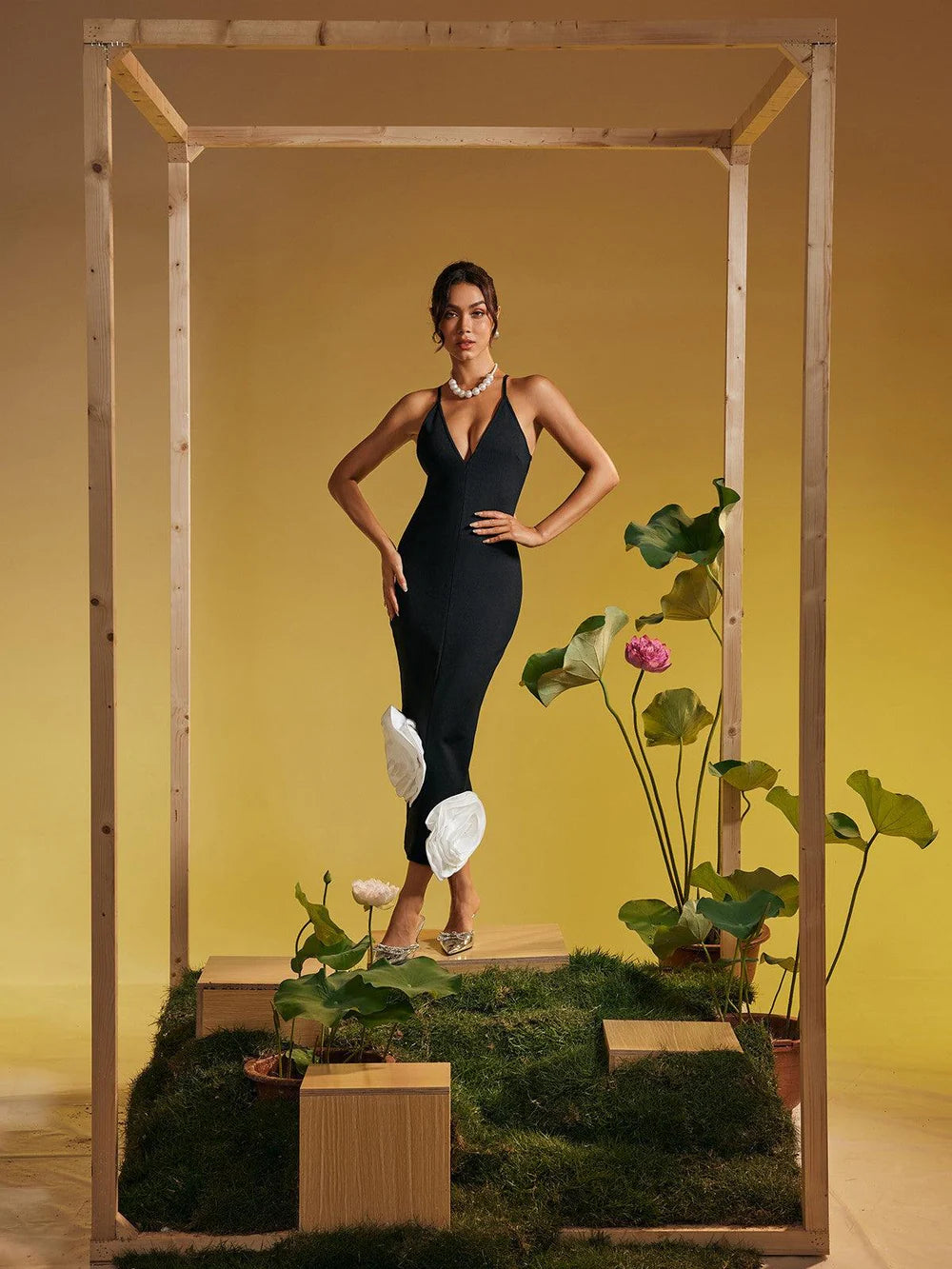 This is a sleek and stylish maxi dress that makes a bold statement. It's a classic black slip dress featuring a fitted silhouette and a deep V-neckline. The standout feature is the two large, intricately detailed white floral appliqués that cascade down the side of the skirt, adding a dramatic and elegant contrast. The dress is perfect for a variety of formal occasions, from a cocktail party to a wedding. The simple yet striking design ensures you'll make a memorable impression.