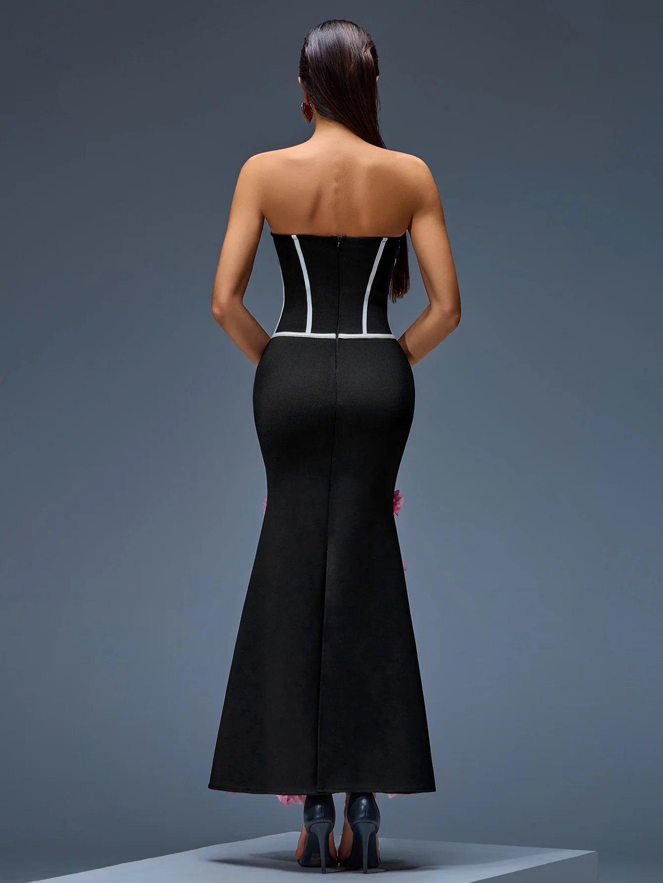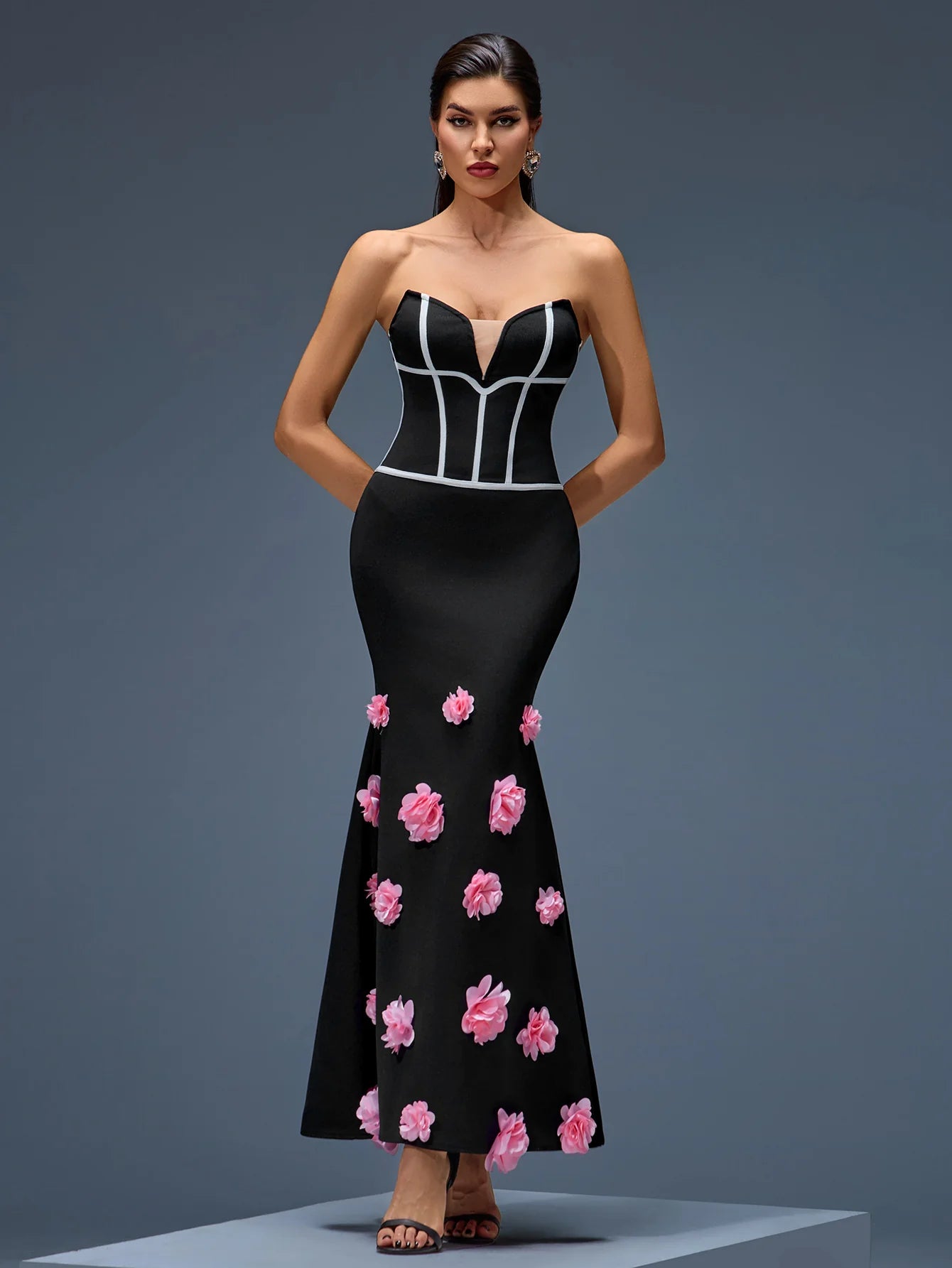 Captivate the room with The Midnight Garden Corset Maxi Dress, a gorgeous statement piece that perfectly blends edgy structure with feminine floral charm. The bodice features a bold strapless, sweetheart neckline with a subtle mesh insert and a provocative corset-inspired design, outlined in crisp white piping against the solid black fabric to create a cinched, form-flattering silhouette. Below the structured top, the dress flows into a sleek mermaid-style maxi skirt that hugs the hips and slightly flares at the hem. This elegant skirt is brought to life by scattered three-dimensional pink chiffon flowers, which trail dynamically down one side of the leg. This unexpected detail gives the black gown a fresh, romantic energy. Finished with a subtle side slit for easy movement, this dress is an exceptional choice for sophisticated cocktail parties, upscale weddings, garden events, or any occasion demanding high-impact, modern glamour.