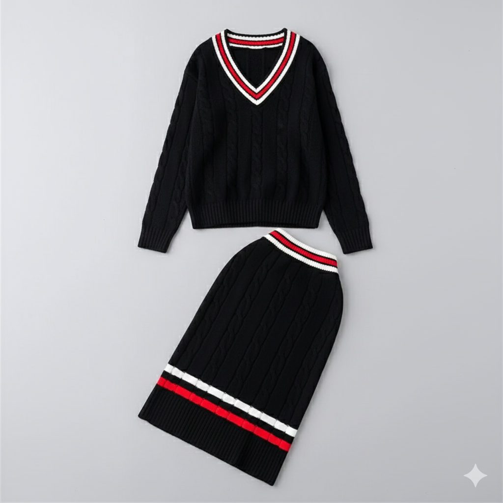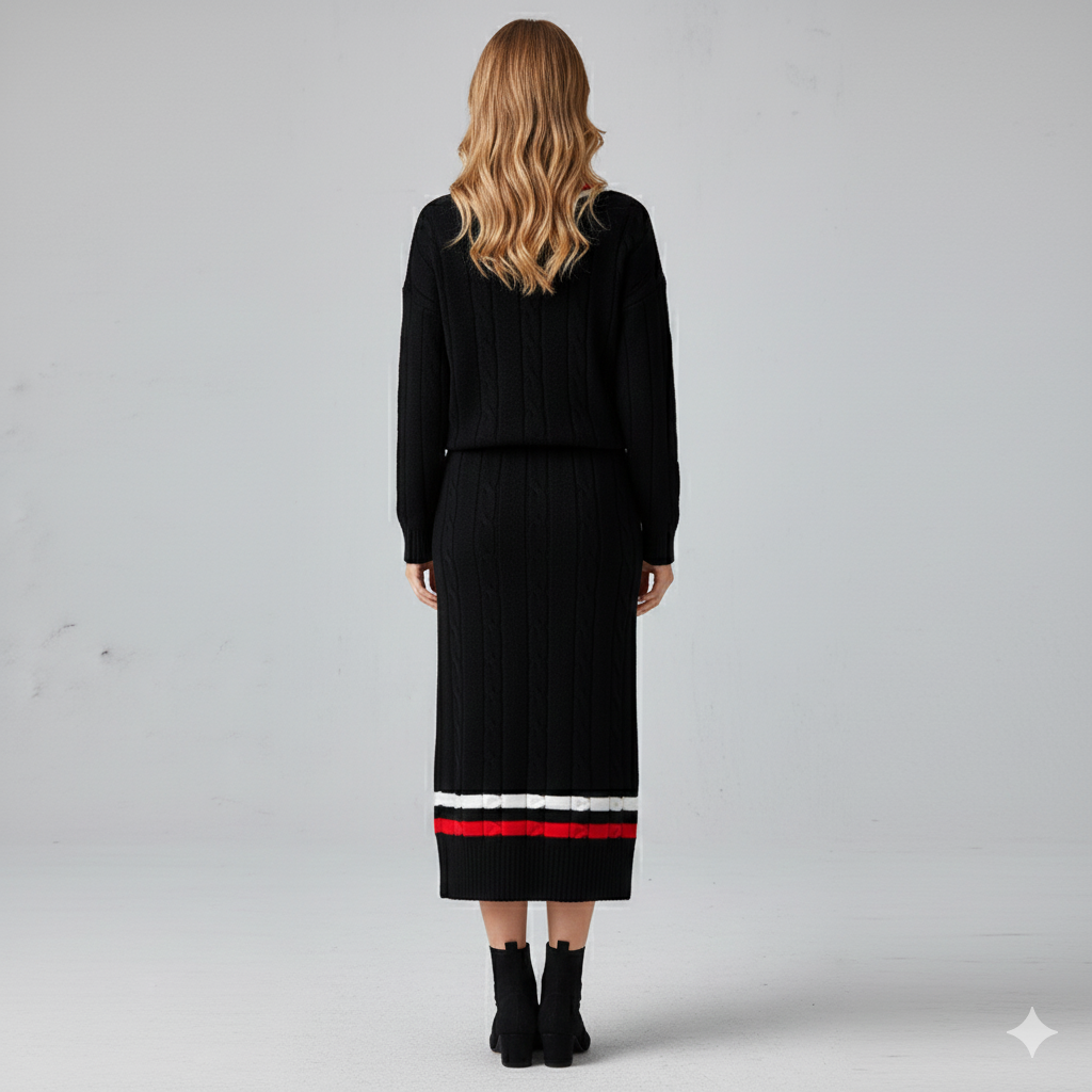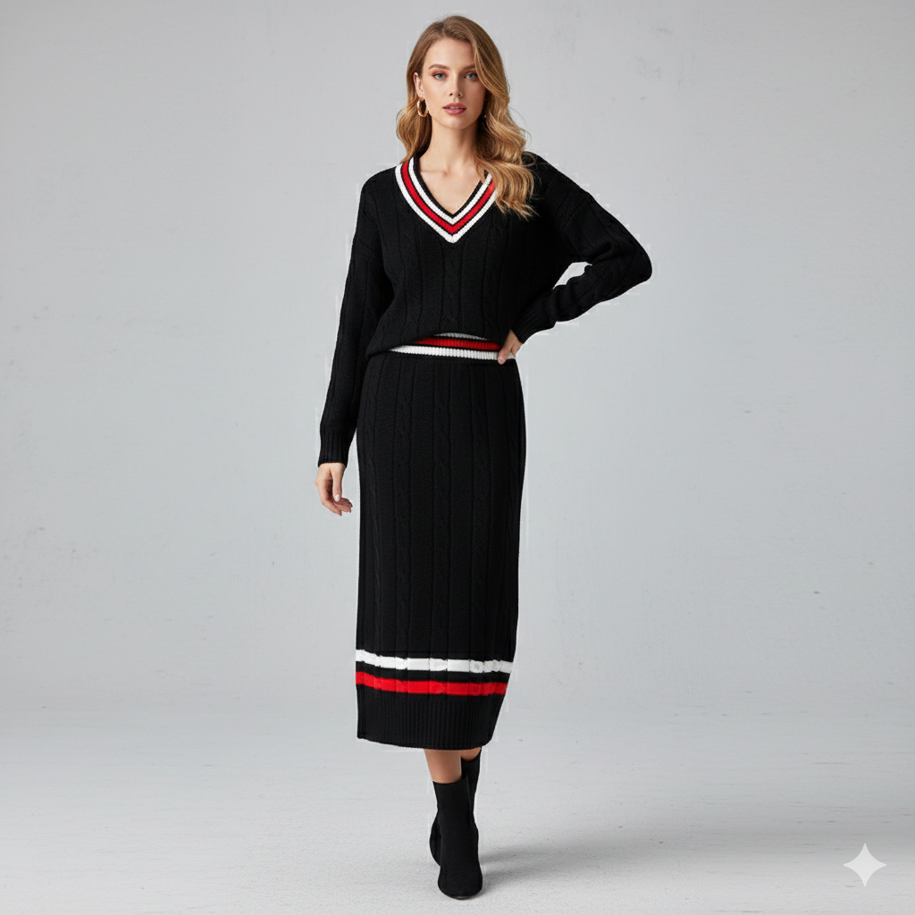 Command attention with this striking two-piece knit set in a deep, sophisticated black, which perfectly marries luxurious texture with a sharp, preppy aesthetic. Both the relaxed-fit long-sleeve sweater and the midi skirt are crafted with a dense cable knit pattern, providing a rich, tactile dimension. The V-neck sweater is accented with bold, crisp varsity tipping in white and red stripes, instantly elevating the look. The coordinating straight-fit midi skirt features a comfortable ribbed waistband finished with the same signature red and white stripes, and is completed by an impressive triple-stripe band near the hemline (red, white, and red), ensuring a strong visual continuity. This chic, monochromatic set is perfect for transitional seasons and can be effortlessly styled for business casual wear or a polished weekend ensemble.